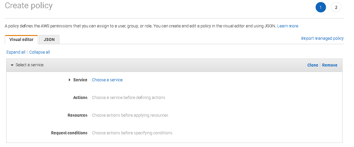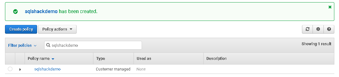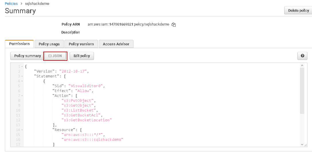정책 만들기 창에서 시각적 편집기를 사용하거나 JSON (자바 스크립트 객체 표기법)을 지정할 수 있습니다. SQLShack에 대한 문서를 참조하여 JSON 언어를 배울 수 있습니다.