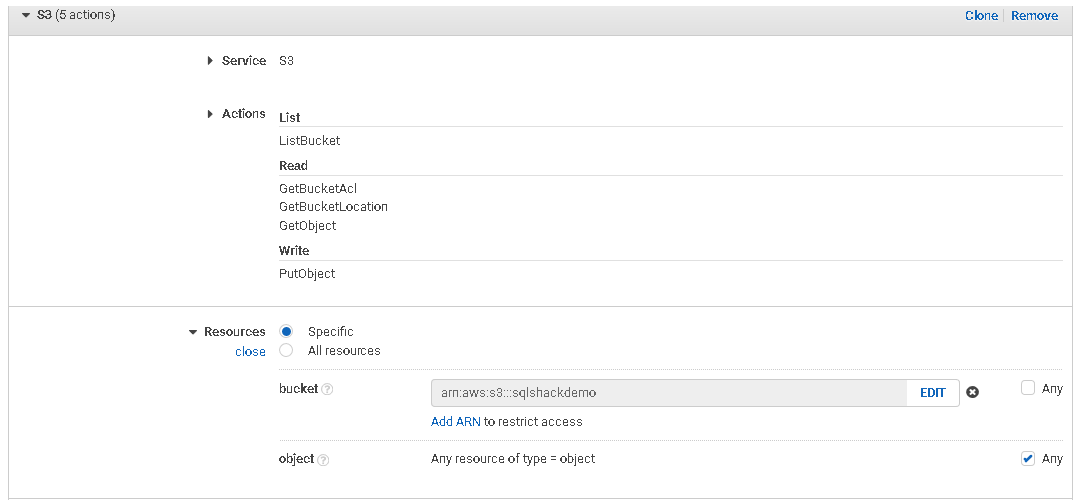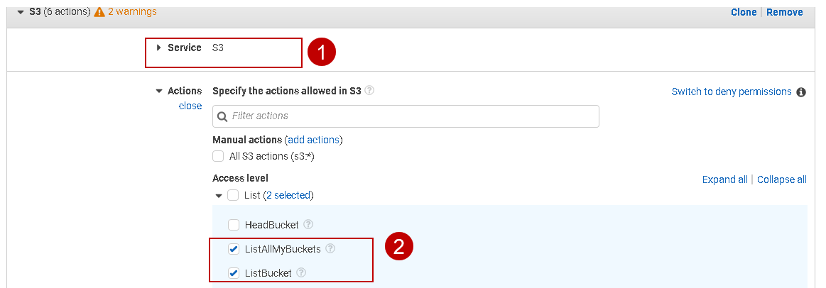 - 작업: 여기서는 이 정책을 사용하여 AWS S3 버킷에 필요한 작업을 지정합니다.마찬가지로 위의 권한 테이블에 정의된 다른 액세스 수준을 선택합니다. 모든 S3 작업 확인란을 사용하여 이 버킷에 대한 모든 권한을 부여할 수 있습니다.