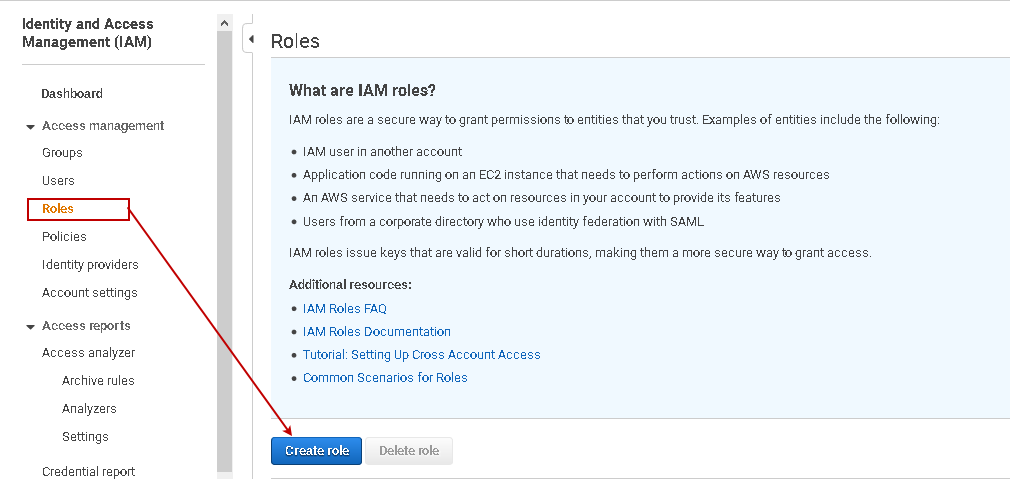 다음 단계에서는 S3 버킷에 대해 정의한 IAM 정책을 사용하는 IAM 역할을 정의합니다. IAM 콘솔에서 역할로 이동합니다. 또한 역할의 홈 페이지에서 IAM 역할에 대한 간략한 설명을 볼 수 있습니다.