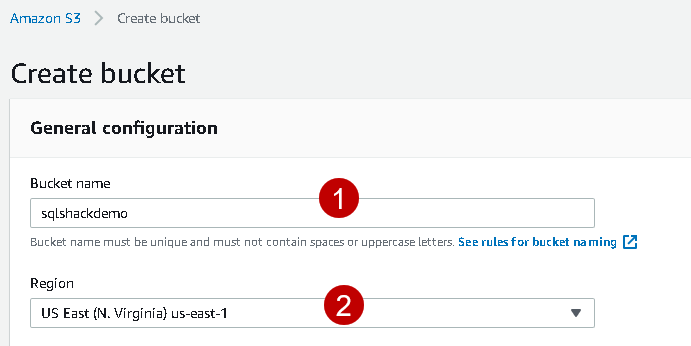 이 문서에서는 기본 속성을 사용하여 버킷을 만듭니다. 아래와 같이 버킷 이름(고유)과 리전을 지정합니다.