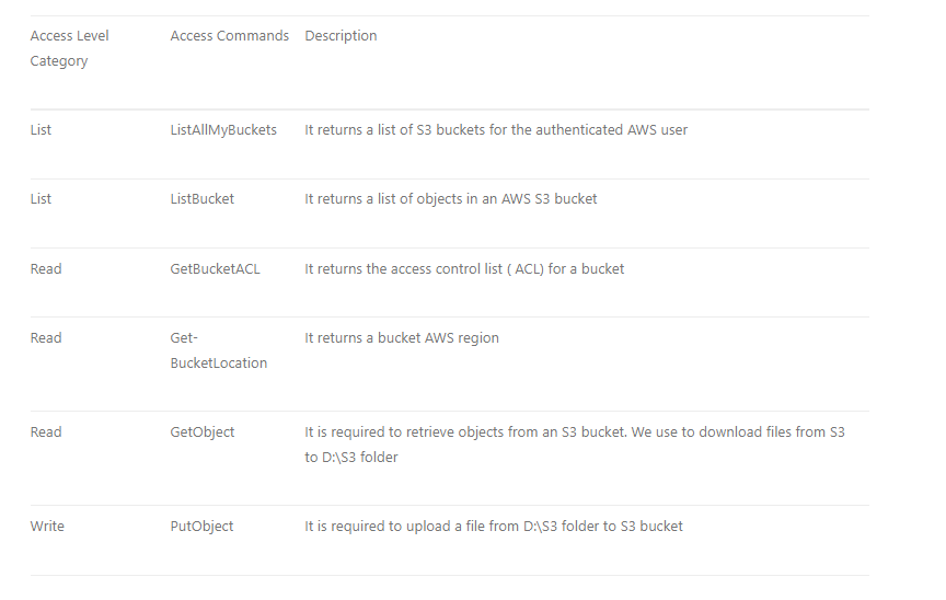 AWS S3 버킷에 사용할 수 있는 많은 권한이 있습니다. 이 문서에서는 다음 사용 권한을 사용합니다.