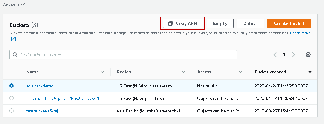 - 여기서 S3 버킷에 대한 Amazon 리소스 이름(ARN)을 지정해야 합니다. S3 객체의 고유한 이름이며 S3 버킷 속성에서 가져옵니다. 이 ARN의 경우 버킷으로 이동하여 버킷을 선택한 다음 ARN 복사 옵션을 사용합니다.