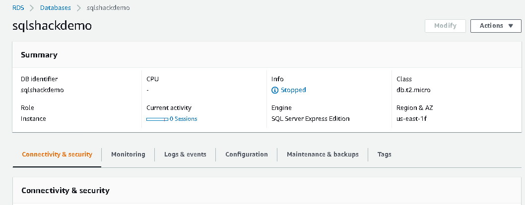 RDS 인스턴스로 이동하여 연결 및 보안으로 이동합니다.