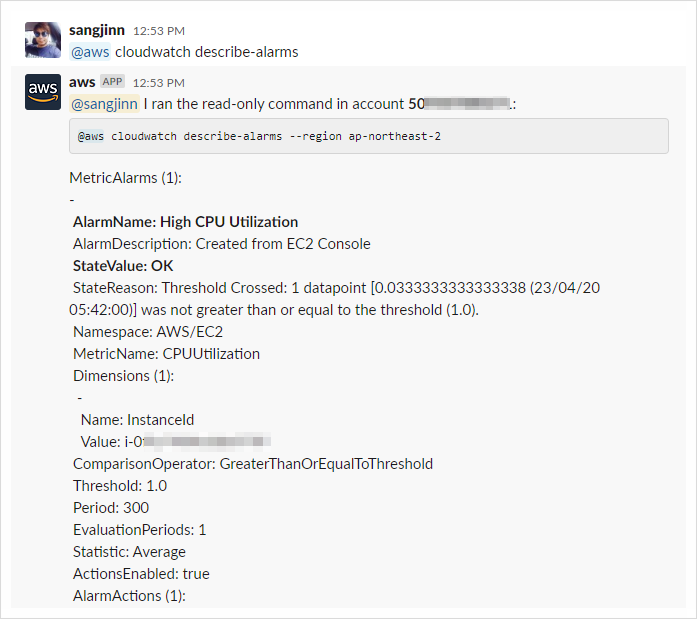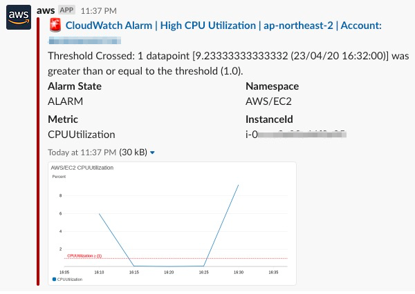 경보가 발생하고 그 경보 설정 시에 설정한 SNS가 AWS 콘솔에서 슬랙 채널 생성 시 옵션으로 설정한 "매핑된 SNS 주제"에 속한다면 슬랙에서 알림을 받을 수 있습니다.