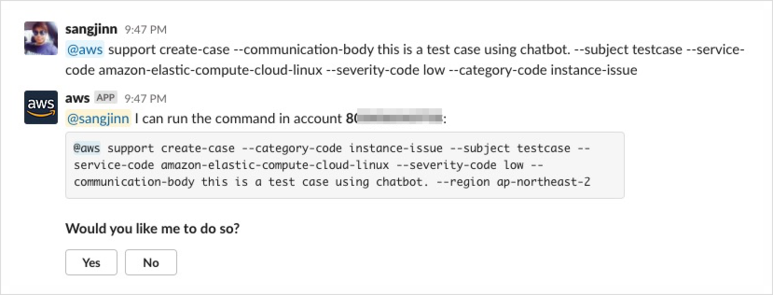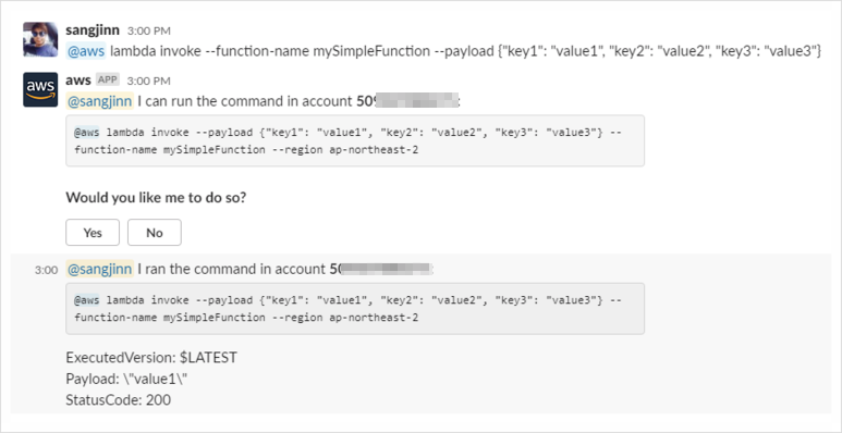 이번에는 미리 AWS에 있는 람다(Lambda) 함수를 실행(invoke) 해봅니다. 람다 함수의 경우 Chatbot이 수행 여부를 확인 차원에서 Yes/No 값으로 한 번 더 물어봅니다. 다양한 기능을 람다에서 서버리스 애플리케이션으로 만들어두고, 슬랙에서 간단하게 수행하여 결괏값을 확인하는 것도 좋을 듯합니다.
