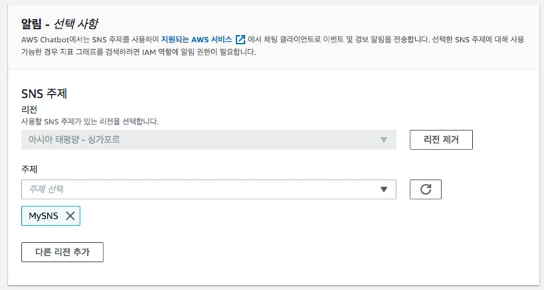 다음은 알림 선택 사항입니다. Amazon SNS(Simple Notification Service)는 알림(Notification)을 이메일, SMS, Push notification 등으로 전달해 주는 서비스인데 기존에 설정한 SNS가 있다면 선택합니다. SNS가 실행되면 해당 메시지를 슬랙을 통해 받을 수 있습니다.