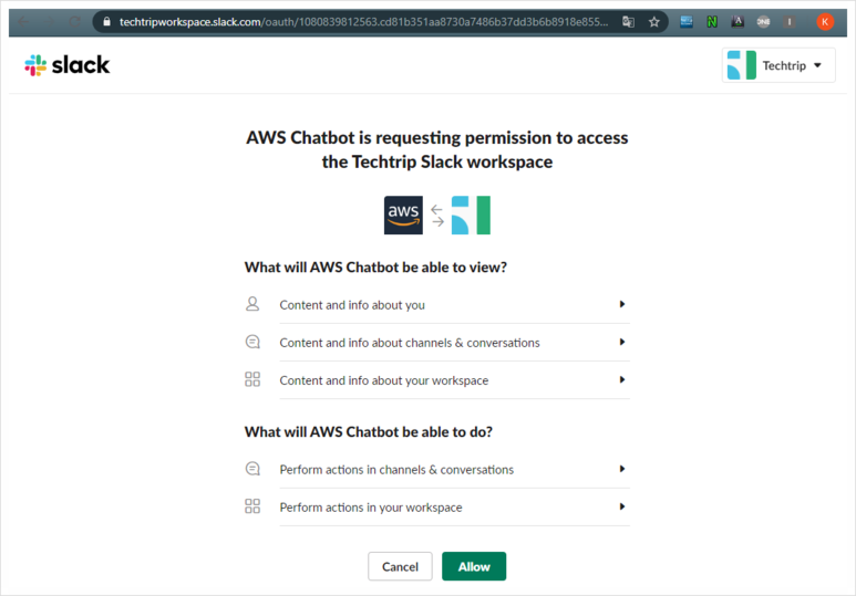 AWS 관리 콘솔은 OAuth 2.0 방식으로 현재 브라우저 사용자의 슬랙 계정을 액세스합니다. 아래 이미지 상단 우측에 AWS Chatbot과 연결할 기존의 슬랙 Workspace를 선택하고(예제에선 "Techtrip"), 해당 워크 스페이스에 대한 AWS의 접속 권한을 승인합니다.