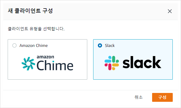 새 클라이언트 구성에서 Slack을 선택합니다. Amazon Chime은 Amazon에서 만든 메시징 서비스입니다.