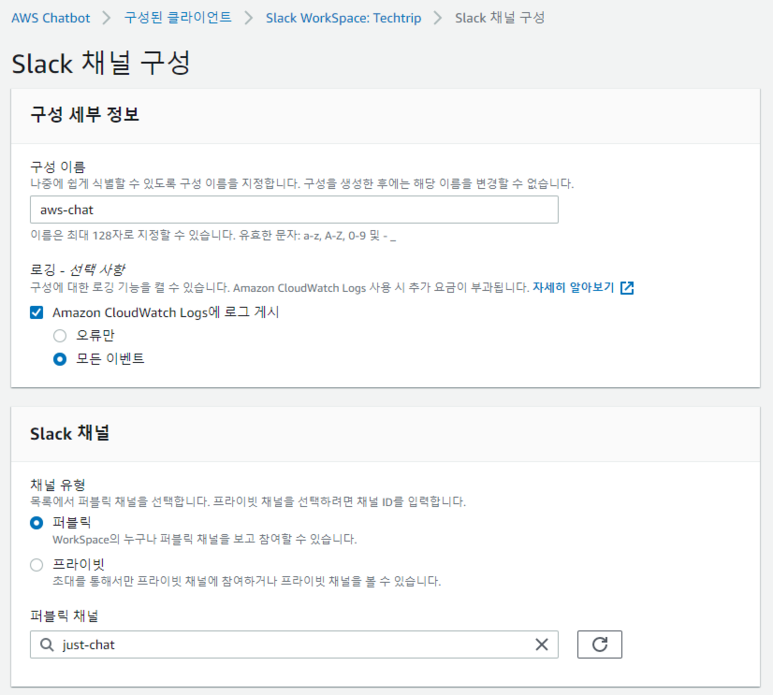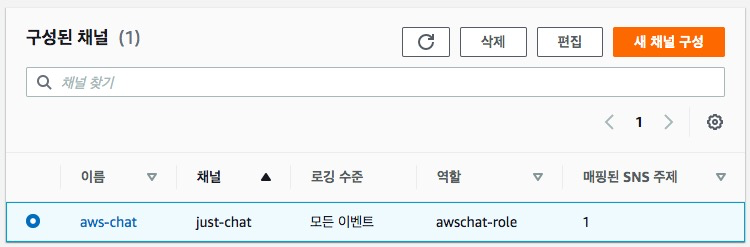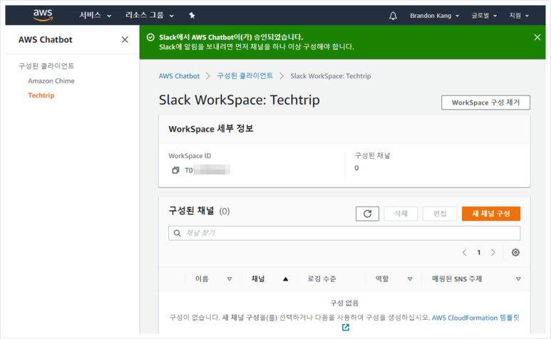 이제 모든 슬랙 채널 구성이 AWS 관리 콘솔에서 완료되었습니다. 완료된 모습은 다음과 같습니다.