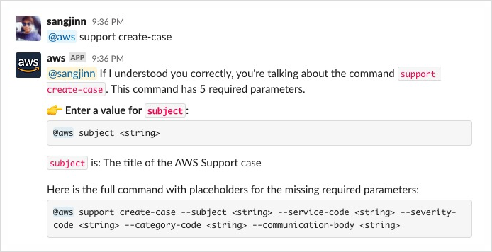 먼저, @aws support create-case 명령을 실행하면, 제목을 입력하라는 응답과 기타 옵션을 알려줍니다.