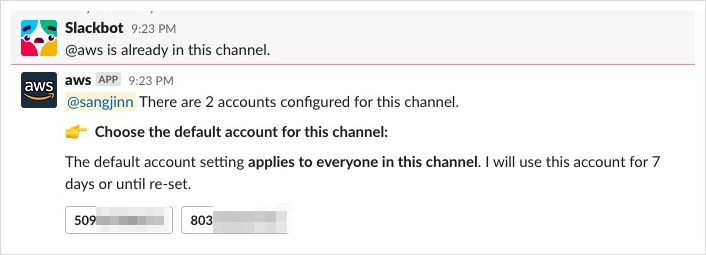 만약 이미 chatbot이 등록된 상태에서 또 다른 AWS 어카운트 Chatbot을 동일한 슬랙 채널에 입장시키려 하면, 두 개의 어카운트 중 기본 어카운트를 골라야 한다는 메시지를 보게 됩니다. 즉, 복수의 AWS 어카운트를 하나의 슬랙 채널에서 동시에 지원할 수 없습니다. 기본 어카운트를 선택하면 그 어카운트는 7일 동안 기본적으로 사용됩니다. 그렇지만 중도에 어카운트 교체는 @aws set default-account [어카운트 ID] 명령으로 언제든 가능합니다.