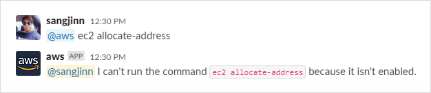 아직까지 슬랙과 AWS Chatbot 연동을 사용한 명령은, 주로 "읽기" 관련 작업이고 AWS에 리소스를 만들거나 기존 리소스를 삭제, 수정하는 등의 "쓰기" 작업을 실행하면 해당 명령은 Enable 되어있지 않음을 알려줍니다.