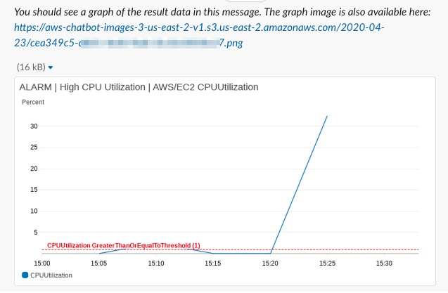 설정한 알람 내역의 그래프도 슬랙 대화상에서 직접 제공됩니다. 아래 이미지에서 파란색의 링크를 클릭하면 확대된 그래프를 이미지로 볼 수 있습니다. URL를 보면, 이미지의 저장 위치는 AWS가 사전에 준비한 Chatbot 전용 S3 버킷으로 보입니다.