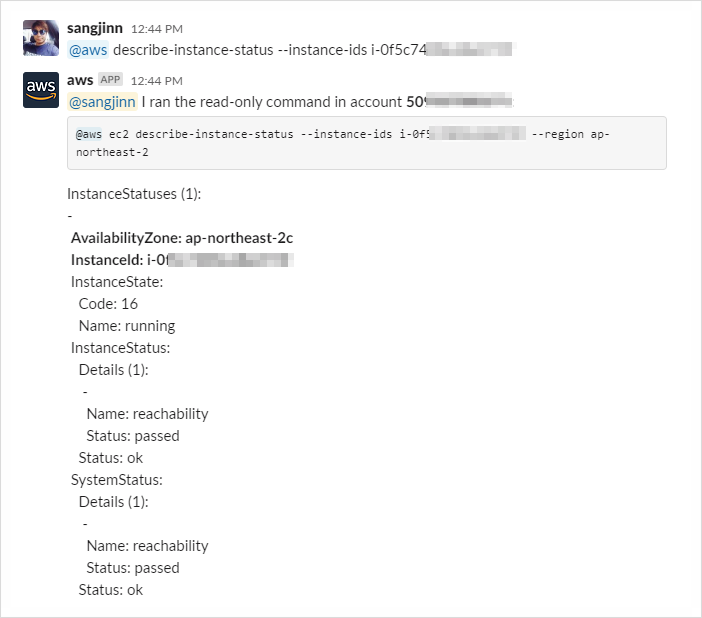 간단한 명령으로 서울 리전의 가용 영역을 슬랙에서 확인해봅니다.