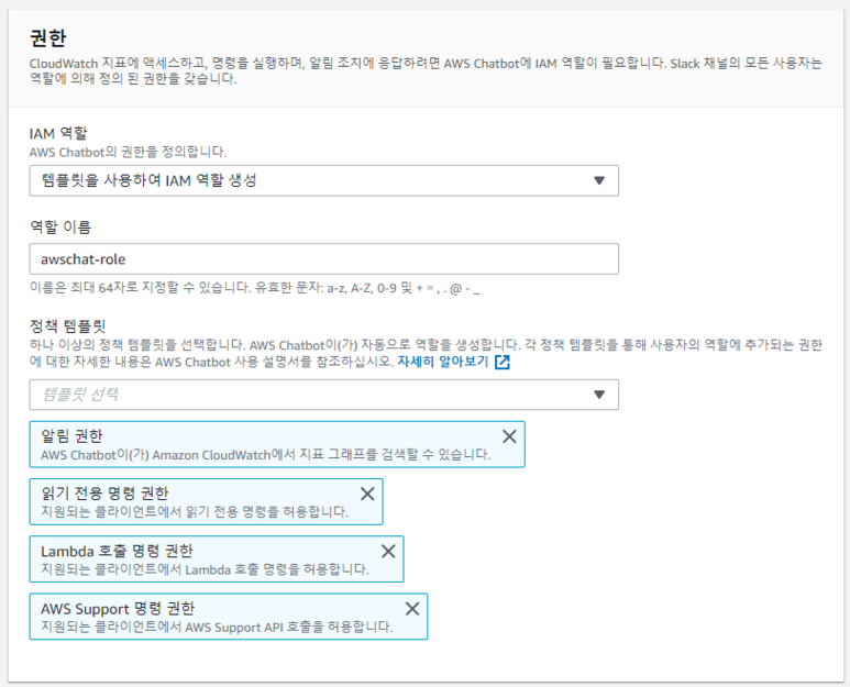 하나 이상의 정책 템플릿을 선택하면 AWS Chatbot이 자동으로 역할을 생성합니다.