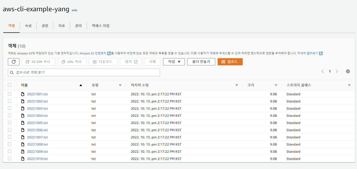 등록이 완료된 후 aws s3 cp 즉 복사 명령어를 사용해서 이 폴더 내에 있는 202210으로 시작하는 모든 텍스트 파일을 S3로 복사 해 주었다.