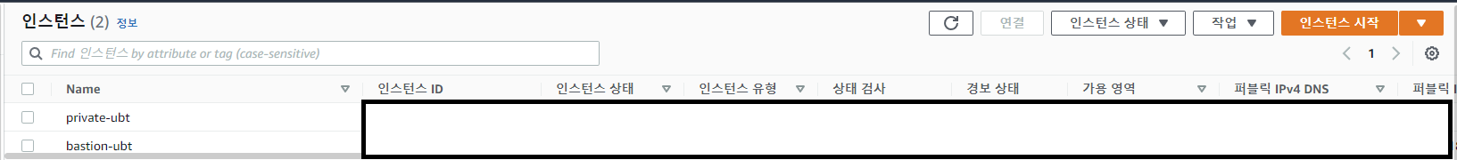먼저 IGW와 연결이 되어있는 Public 존에 있는 bastion UBT라는 인스턴스 하나와 Private 존에 있는 private EC2
