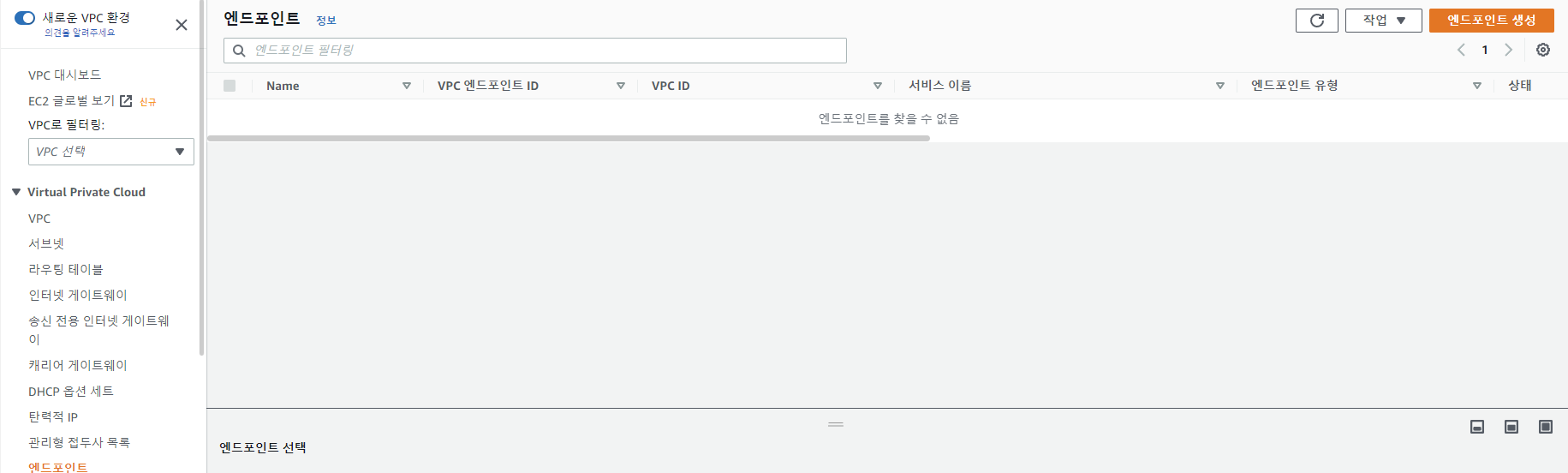 콘솔에 VPC를 검색한 후 들어와서 엔드포인트 생성을 클릭한다.