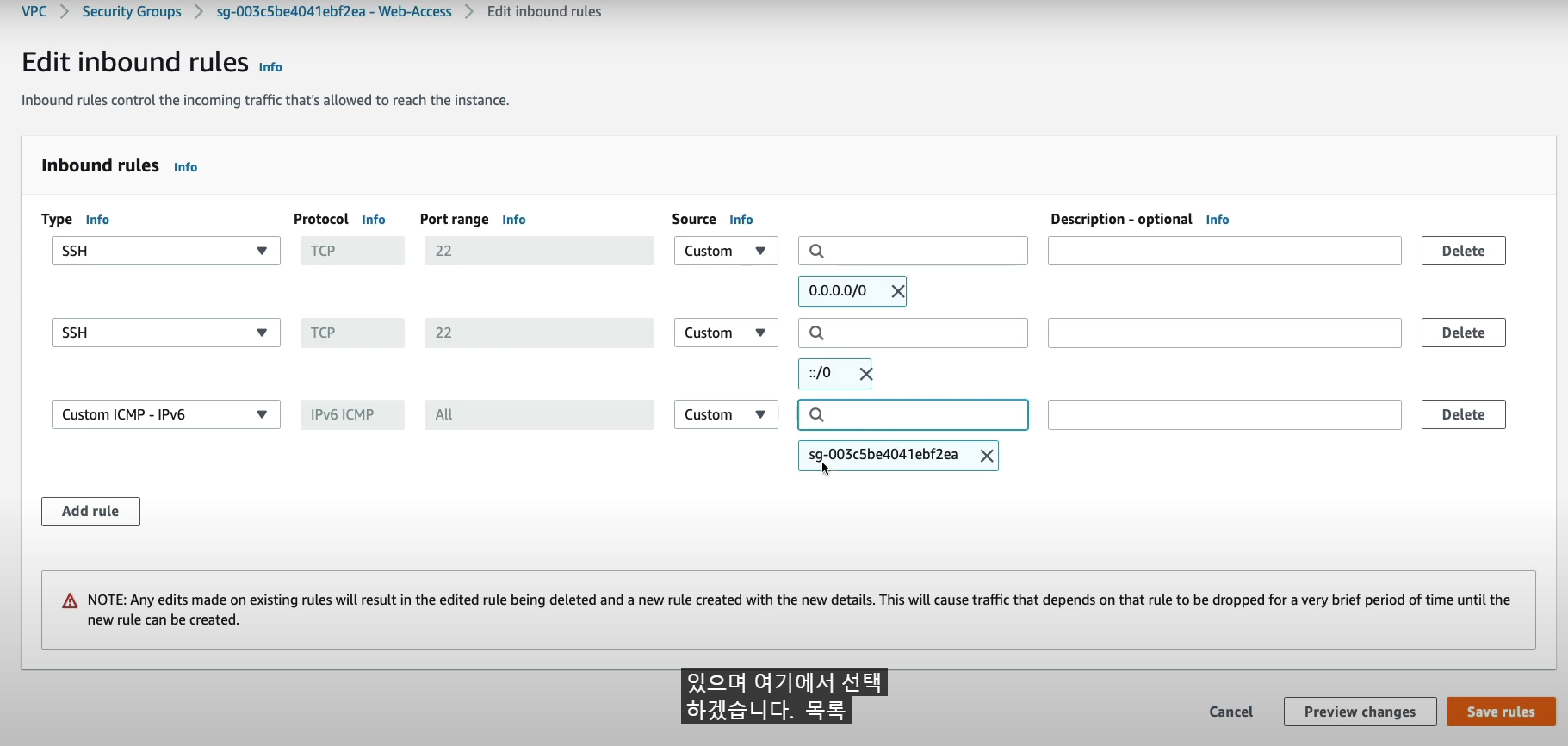 - 인바운드 / 아웃바운드 --> ::/0 확인